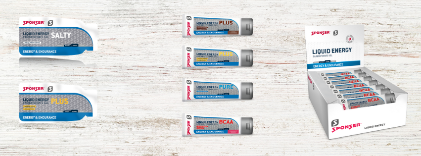 عبوة تحتوي على 40 كيس جل طاقة من Sponser، كل كيس يحتوي على تركيز كربوهيدرات مع إلكتروليتات (صوديوم، بوتاسيوم) و25 ملغ كافيين.